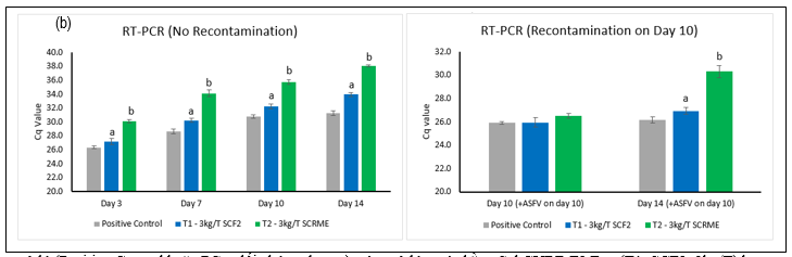 Hình 2.Phát hiện ASFV bằng RT-PCR trong cám chưa xử lý (Positive Control hoặc PC – đối chứng dương), cám xử lý trước bằng Sal CURB F2 Dry (T1; SCF2, 3kg/T) hay Sal CURB RM E Liquid (T2; SCRME, 3kg/T) vào ngày (a) 3, 7, 10, và 14 sau gây nhiễm (dpc) cũng như (b) cám gây tái nhiễm ASFV vào ngày 10-dpc và được đánh giá lại vào ngày 10- và 14 sau tái nhiễm (dpc). Không phát hiện giá trị Cq trong tất cả nhóm đối chứng âm. Chữ cái khác nhau chỉ ra sự khác biệt đáng kể giữa các nhóm. (P < 0.05).
