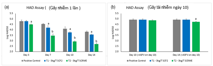 Trong phân tích HAD, một xu hướng tương tự cũng được quan sát thấy, SCF2 và SCRME cho thấy sự giảm đáng kể (P<0.05) về giá trị HAD ở ngày 7 và 3 sau khi gây nhiễm, tương ứng (Hình 3a). Ở nghiên cứu gây tái nhiễm cám, SCRME cho thấy giảm đáng kể về giá trị HAD vào ngày thứ 4 sau khi tái gây nhiễm (Hình 3b).