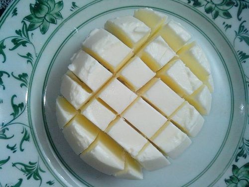 Bước 5: Mang đi ủ khoảng 4-5 tiếng, sau đó bỏ ngăn mát tủ lạnh. Mọi người cắt miếng vuông vuông trộn cùng hoa quả hoặc bột cacao ( milo cũng được nhé)