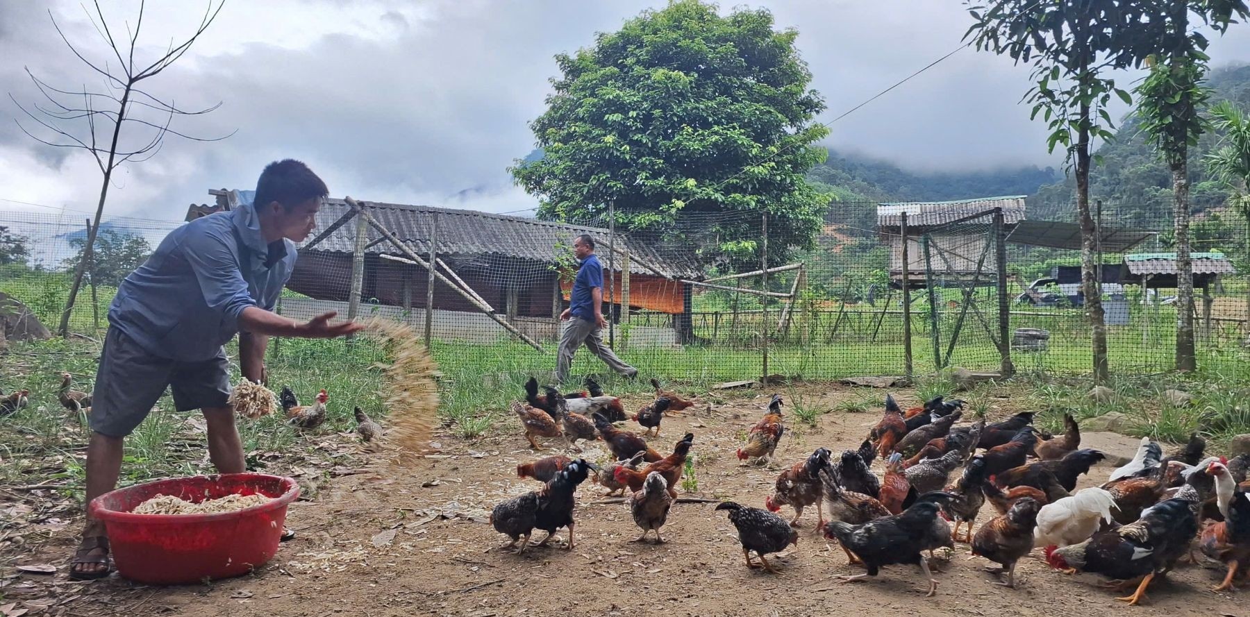 Năm 2019, anh quyết tâm khởi nghiệp lần hai với mô hình nuôi gà bản địa. Ban đầu, anh Trung đi gom gà giống trong bản về nuôi, nhân đàn. Nhờ kiên trì học hỏi kỹ thuật và chú trọng phòng bệnh, đàn gà phát triển ổn định và nhân giống nhanh.