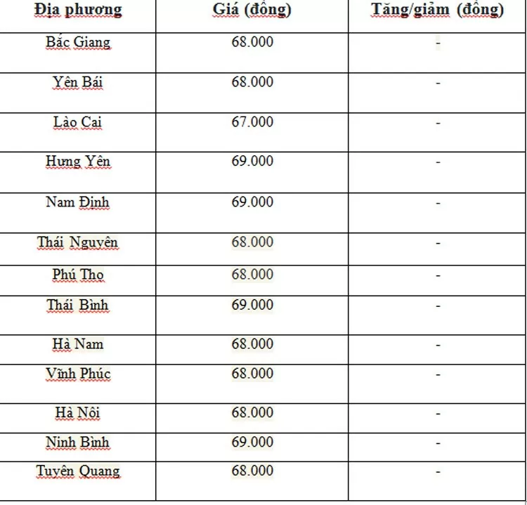 Ở chiều ngược lại, mức giá cao nhất khu vực 69.000 đồng/kg được ghi nhận tại Hưng Yên, Nam Định, Thái Bình và Ninh Bình.