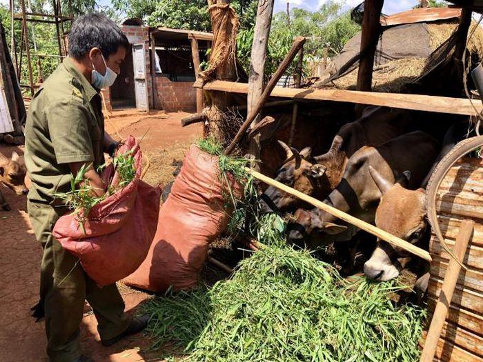 Người dân làng Bia Bre, xã Ia Pết, huyện Đak Đoa chăm sóc bò bị bệnh viêm da nổi cục. Ảnh: Đăng Lâm.