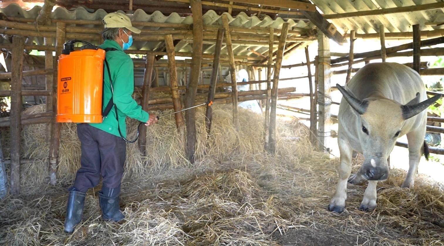 Phun thuốc khử trùng chuồng trại. Ảnh: Mỹ Lệ