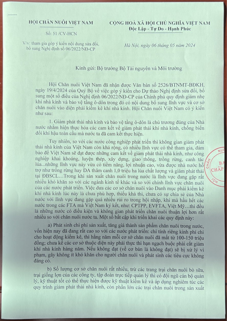 Hội Chăn nuôi Việt Nam đã nhận được Văn bản số 2526/BTNMT-BĐKH, ngày 19/4/2024 của Bộ về việc góp ý kiến cho Dự thảo Nghị định sửa đổi, bổ sung một số điều của Nghị định 06/2022/NĐ-CP của Chính phủ quy định giảm nhẹ khí nhà kính và bảo vệ tầng ô-dôn trong đó có nội dung bổ sung lĩnh vực và cơ sở chăn nuôi vào diện phải kiểm kê khí nhà kính. Hội Chăn nuôi Việt Nam có ý kiến như sau:
