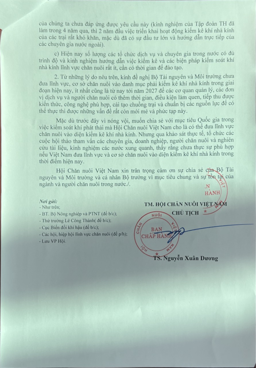 2. Từ những lý do nêu trên, kính đề nghị Bộ Tài nguyên và Môi trường chưa đưa lĩnh vực, cơ sở chăn nuôi vào danh mục phải kiểm kê khí nhà kính trong giai đoạn hiện nay, ít nhất cũng là từ nay tới năm 2027 để các cơ quan quản lý, các đơn vị dịch vụ và người chăn nuôi có thêm thời gian, điều kiện làm quen, tiếp thu được kiến thức, công nghệ phù hợp, cải tạo chuồng trại và chuẩn bị các nguồn lực để có thể thực thi được những vấn đề rất còn mới mẻ và phức tạp này.