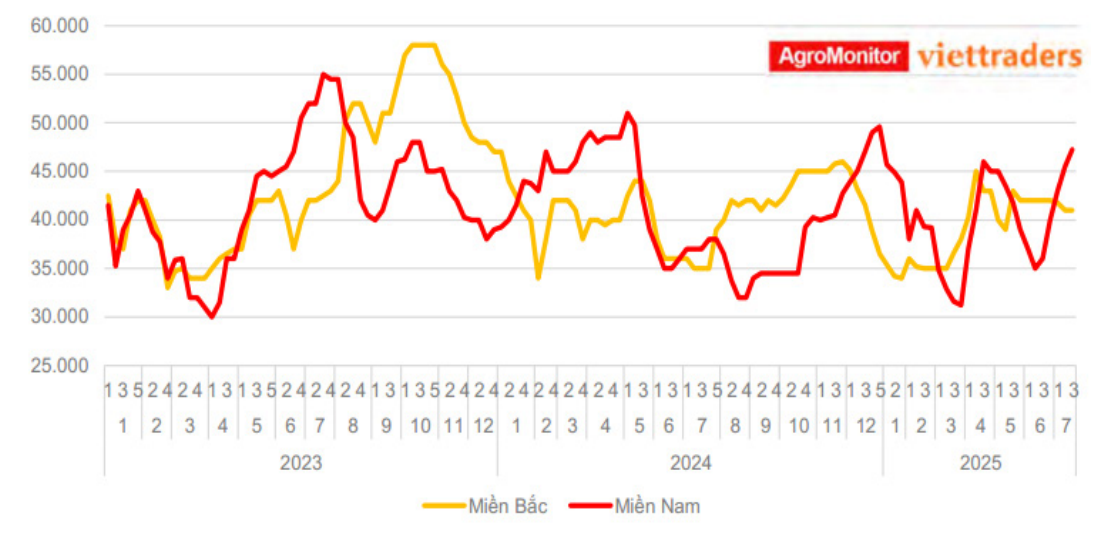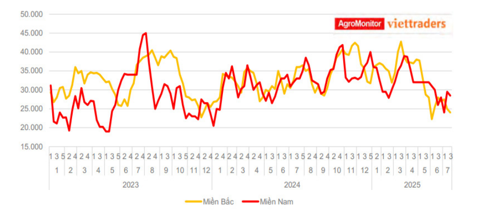 Tại miền Bắc, giá gà trắng có thời điểm phục hồi nhờ nhu cầu tiêu thụ tăng, nhưng sau đó quay đầu giảm do nguồn cung nội vùng dư thừa. Giá bán tại trại phổ biến còn 23.000 – 24.000 đồng/kg. Trong khi đó, tại miền Nam, nhờ chênh lệch giá hấp dẫn giữa Việt Nam và Campuchia (khoảng 12.000 – 14.000 đồng/kg), thương lái đẩy mạnh gom gà xuất sang Campuchia (25.000- 30.000 con/ngày), giúp giá nội địa duy trì ở mức ổn định 28.000 – 29.000 đồng/kg.
