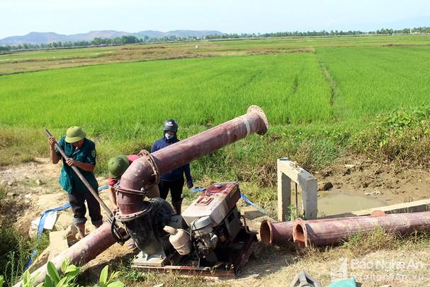 Người dân Hưng Nguyên lắp đặt máy bơm chống hạn. Ảnh: Phú Hương