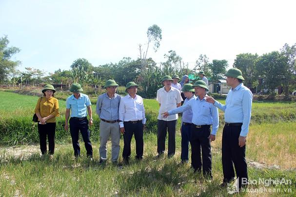 Đồng chí Hoàng Nghĩa Hiếu chỉ đạo cứu lúa tại huyện Nghi Lộc ngày 18/7. Ảnh: Phú Hương