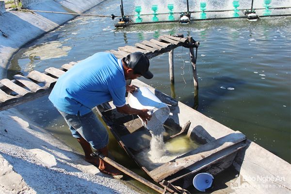 Nông dân xã Quỳnh Thanh (Quỳnh Lưu) dùng vôi bột xử lý ao nuôi tôm. Ảnh: Việt Hùng