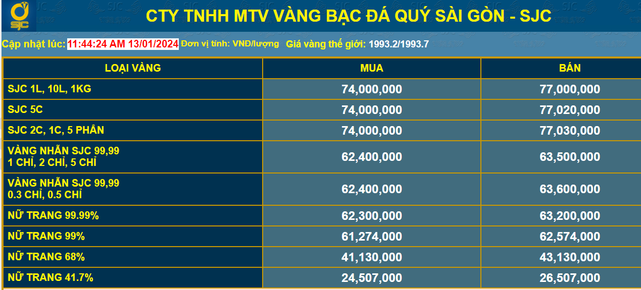 Thời điểm 16h chiều nay 14/1/2024, giá vàng SJC trong nước vẫn đang ở ngưỡng cao, với 77 triệu đồng/lượng ở chiều bán ra. Cụ thể, tại Công ty TNHH MTV Vàng Bạc Đá quý Sài Gòn, giá vàng SJC niêm yết chiều mua vào ở mức 74 triệu đồng/lượng và bán ra ở mức 77 triệu đồng/lượng.