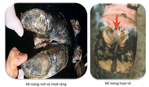 Kiểm tra phần đáy móng, thấy phần cứng có nhiều vết lõm hình tròn hay bầu dục, to nhỏ khác nhau như vết hà khoai lang. Dùng dao cạo vết lõm, thấy màu đen như than bùn, nát, mùi thối đặc biệt. Chọc sâu vào chỗ hà, con vật sẽ có phản ứng đau.