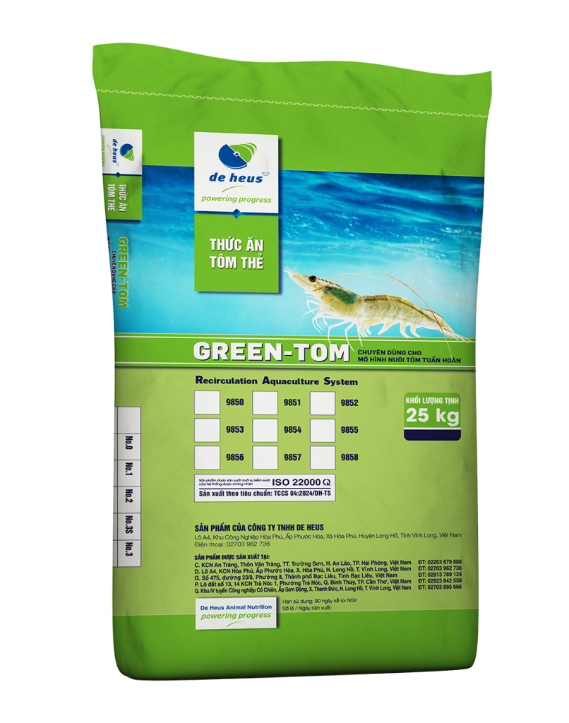 Tính đến nay, De Heus đã phát triển 19 dòng sản phẩm thức ăn tôm như START-TOM, POST-TOM, HI-TOM, GREEN TOM… theo mô hình chứng nhận ASC Feed. Các sản phẩm này đảm bảo cung cấp dinh dưỡng tối ưu, không chứa chất cấm và tuân thủ nghiêm ngặt các tiêu chuẩn quốc tế về an toàn sinh học và truy xuất nguồn gốc, đồng thời đáp ứng yêu cầu xuất khẩu sang các thị trường khó tính như Mỹ, EU, Nhật Bản…