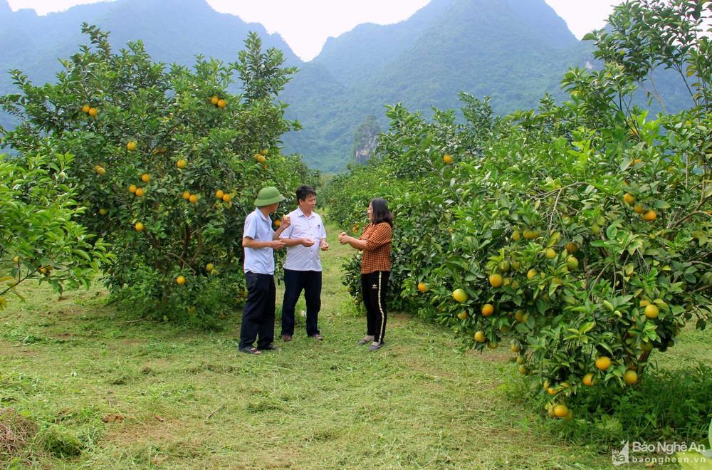 Một số cây cam giống Xã Đoài lòng vàng tại xã Đỉnh Sơn được chăm sóc tốt, cho quả sum suê. Ông Nguyễn Duy Hóa ở xóm 1, Nông trường Bãi Phủ, xã Đỉnh Sơn có gần 2ha cam, chia sẻ: Sở dĩ vườn cam nhà tôi ít bị rụng quả là bởi chúng tôi đầu tư, chăm sóc cẩn thận từng khâu, thường xuyên cắt tỉa những cành không cần thiết, tạo cho cây cam thoáng đãng, có không gian để phát triển, giữa 2 luống cam đều có rãnh thoát nước để tiêu úng khi ngập lụt". Ảnh: Xuân Hoàng