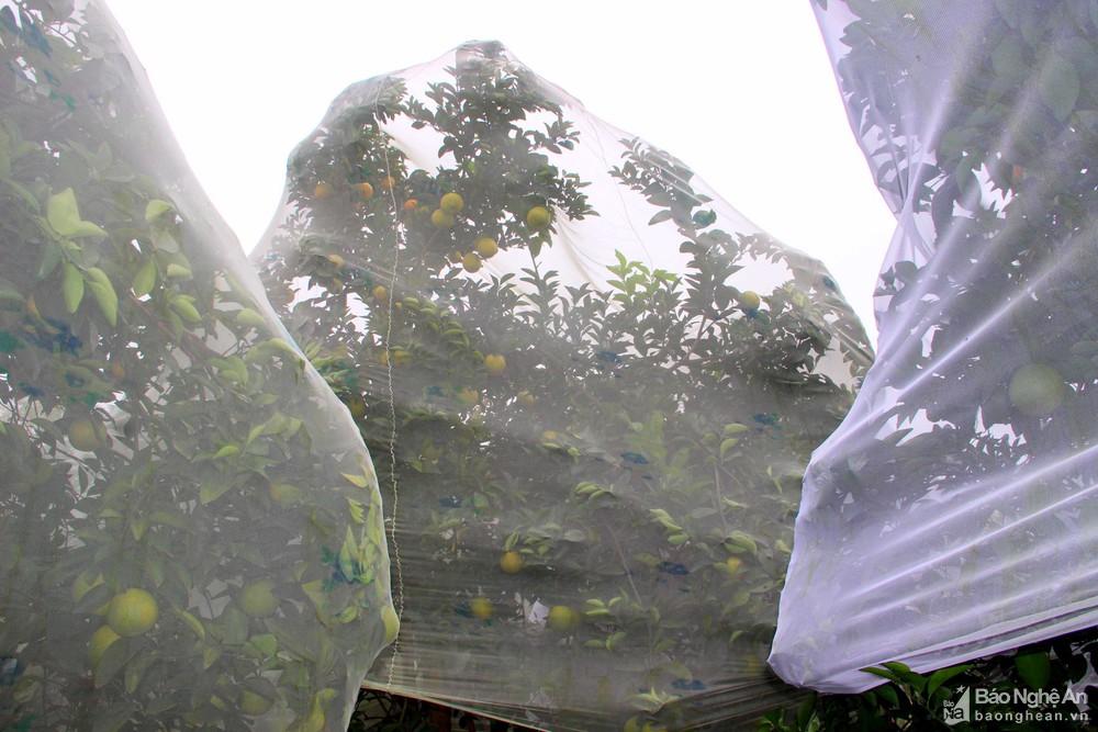 Để giữ lại số lượng cam còn sót lại sau mưa lũ cũng như tránh côn trùng phá hoại, một số chủ vườn đã phủ màn để bảo vệ cam, chờ bán vào dịp Tết sắp tới. Ảnh: Xuân Hoàng