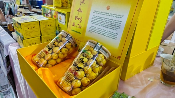 Gian hàng HTX Dược liệu trà hoa vàng Ba Chẽ, chuyên các sản phẩm từ hoa và lá trà hoa vàng thu hút khách ghé thăm bởi các hộp trà có màu vàng nổi bật tự nhiên nhờ công nghệ sấy thăng hoa.