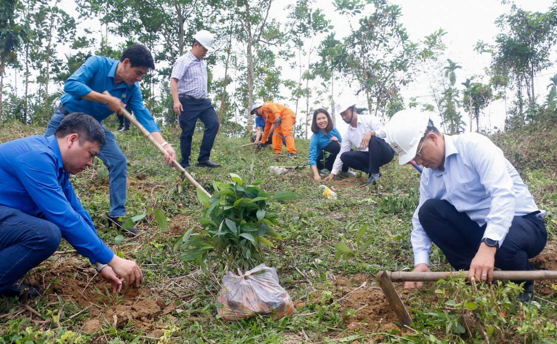 | Lãnh đạo, đoàn viên công đoàn và tuổi trẻ EVNCPC, PC Quảng Nam tham gia trồng cây gây rừng tại xã Trà Tân. Ảnh: V.H |