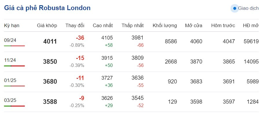 Kết thúc phiên giao dịch, giá cà phê Robusta trên sàn London ngày 1/7/2024 lúc 4h30 giảm ở mức 3.588 - 4.011 USD/tấn. Cụ thể, kỳ hạn giao hàng tháng 9/2024 là 4.011 USD/tấn (giảm 36 USD/tấn); kỳ hạn giao hàng tháng 11/2024 là 3.850 USD/tấn (giảm 15 USD/tấn); kỳ hạn giao hàng tháng 1/2024 là 3.680 USD/tấn (giảm 11 USD/tấn) và kỳ hạn giao hàng tháng 3/2025 là 3.588 USD/tấn (giảm 9 USD/tấn).