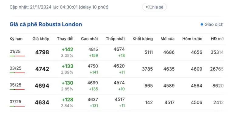 Kết thúc phiên giao dịch, giá cà phê Robusta trên sàn London lúc 4h30 ngày 21/11/2024 sau nhiều phiên giảm đã bất ngờ tăng mạnh, mức tăng từ 128 - 142 USD/tấn. Cụ thể, kỳ hạn giao hàng tháng 1/2025 là 4.798 USD/tấn (tăng 142 USD/tấn); kỳ hạn giao hàng tháng 3/2025 là 4.742 USD/tấn (tăng 133 USD/tấn); kỳ hạn giao hàng tháng 5/2025 là 4.694 USD/tấn (tăng 130 USD/tấn) và kỳ hạn giao hàng tháng 7/2025 là 4.634 USD/tấn (tăng 128 USD/tấn).