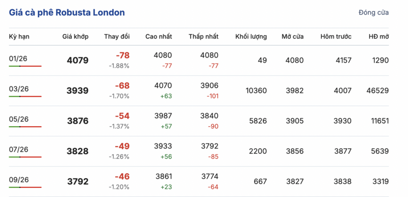 Kết thúc phiên giao dịch gần nhất, giá cà phê Robusta tại London đảo chiều giảm mạnh đồng loạt trong các kỳ giao hàng. Cụ thể, kỳ giao tháng 1/2026 giảm mạnh 78 USD/tấn, xuống mức 4079 USD/tấn. Hợp đồng giao kỳ hạn tháng 9/2026 cũng giảm 46 USD/tấn, đạt mức 3792 USD/tấn.