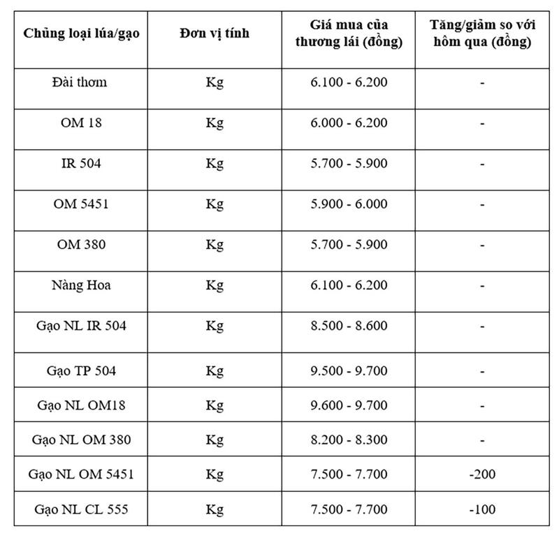 Với mặt hàng lúa, theo cập nhật từ Sở Nông nghiệp và Môi trường tỉnh An Giang, hiện giá lúa OM 5451 (tươi) dao động mốc 5.900 - 6.000 đồng/kg; giá lúa Đài Thơm 8 (tươi) dao động ở mốc 6.100 - 6.200 đồng/kg; giá lúa OM 18 (tươi) dao động ở mốc 6.000 - 6.200 đồng/kg; gia lúa IR 50404 (tươi) dao động ở mức 5.700 - 5.900 đồng/kg; giá lúa Nàng Hoa 9 dao động ở mức 6.000 - 6.200 đồng/kg; giá lúa (tươi) OM 308 dao động ở mức 5.700 - 5.900 đồng/kg so với cuối tuần.