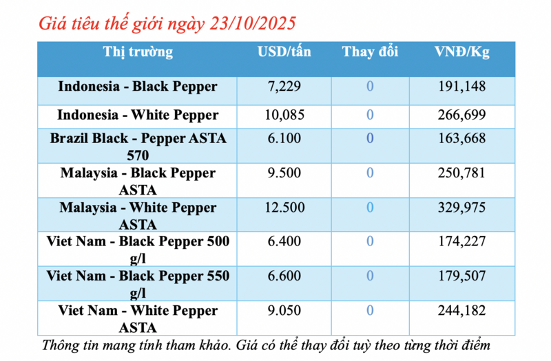 Cập nhật giá tiêu thế giới từ Hiệp hội Hồ tiêu Quốc tế (IPC) lúc 4 giờ 30 phút sáng 23/10/2025, thị trường hồ tiêu xuất khẩu hôm nay không ghi nhận biến động. Các thị trường đều ổn định giá so với hôm qua.