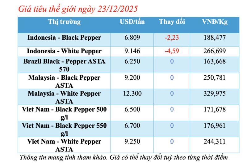 Tại Malaysia, giá tiêu đen ASTA hiện đang ổn định ở mức 9.200 USD/tấn. Giá tiêu trắng ASTA tại thị trường này trong ngày hôm nay đạt 12.300 USD/tấn, không biến động so với ngày hôm qua.