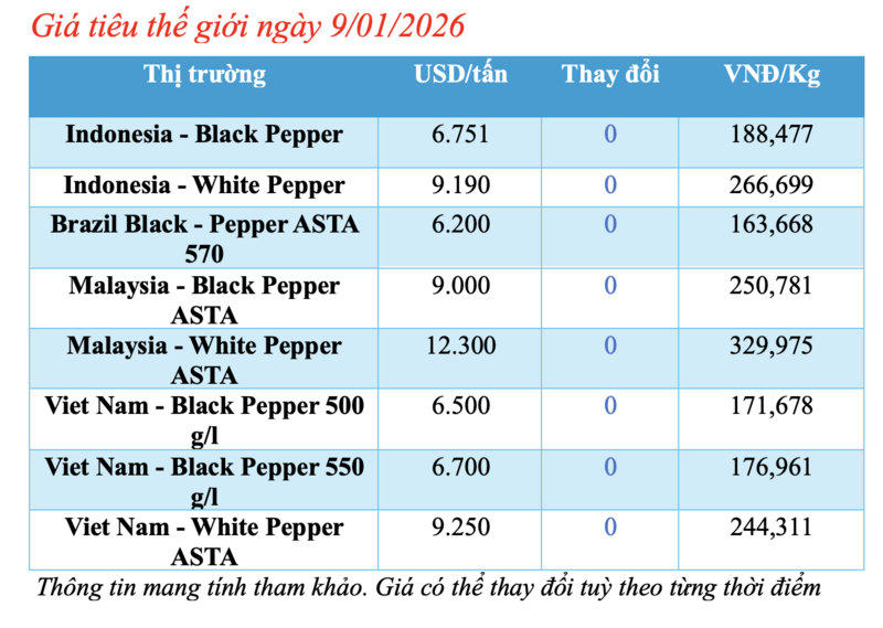 Tại Malaysia, giá tiêu đen ASTA hiện đang ổn định ở mức 9.000 USD/tấn. Giá tiêu trắng ASTA tại thị trường này trong ngày hôm nay đạt 12.300 USD/tấn, không biến động so với ngày hôm qua.