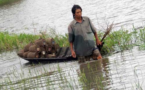 Nước ngập trắng đồng, người dân huyện Vị Thủy (Hậu Giang) đặt lọp mưu sinh. Ảnh: H.X