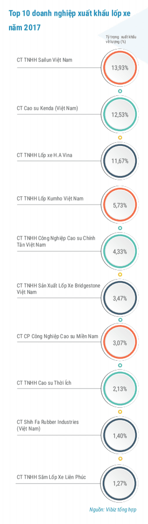 Trong các doanh nghiệp FDI sản xuất lốp xe tại Việt Nam, Công ty TNHH Sailun Việt Nam là một doanh nghiệp tiêu biểu cho xu hướng Radial hóa. Không chỉ đáp ứng được một phần nhu cầu sử dụng lốp Radial của người tiêu dùng Việt mà trong năm 2017, doanh nghiệp này đã xuất khẩu khoảng 104 nghìn chiếc lốp xe ô tô Radial sang các thị trường như: Mỹ, Canada, Hàn Quốc,... Ngoài các doanh nghiệp FDI có tên tuổi quen thuộc như: Công ty Cao Su Kenda (Việt Nam), Công ty TNHH Lốp xe H.A Vina, Công ty TNHH Lốp Kumho Việt Nam,..., thì Công ty CP Công Nghiệp Cao Su Miền Nam là một doanh nghiệp nội địa đóng góp 3,07% tỷ trọng xuất khẩu các loại lốp xe. Với hơn 40 năm xây dựng và phát triển, doanh nghiệp này đã trở thành nhà sản xuất lốp xe hàng đầu Việt Nam và là đơn vị dẫn đầu ngành sản xuất săm, lốp xe cao su trong nước.