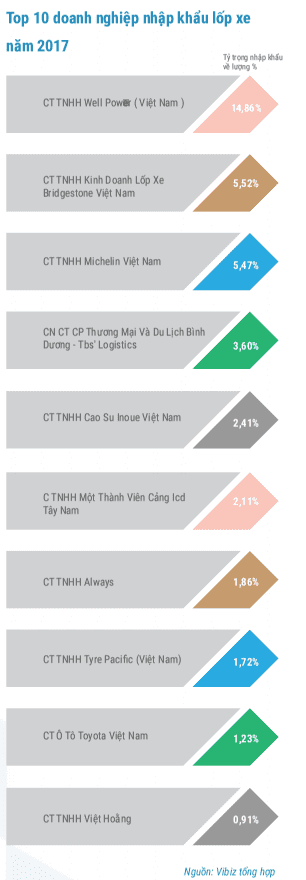 Các doanh nghiệp FDI tiếp tục đứng đầu top các doanh nghiệp nhập khẩu lốp xe nhiều nhất năm 2017, trong đó Công ty TNHH Michelin Việt Nam là một trong các doanh nghiệp nhập khẩu nhiều lốp xe mô tô Radial từ Thái Lan. Bên cạnh đó, các nhà phân phối lốp xe hàng đầu Việt Nam cũng nhập khẩu một lượng lớn lốp xe nhằm đáp ứng nhu cầu tiêu thụ trong nước của người dân như: Chi nhánh Công ty CP Thương Mại Và Du Lịch Bình Dương -Tbs' Logistics nhập khẩu lốp ô tô, lốp xe tải chính hãng của Michelin từ thị trường Thái Lan, Hungary, Pháp, Mỹ,...