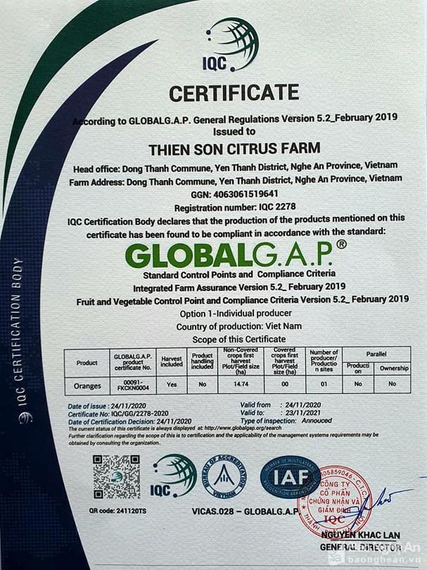 Một tin vui đối với Nghệ An và thương hiệu cam Vinh nói chung và thương hiệu cam Thiên Sơn nói riêng, là tại Nghệ An có thêm một trang trại cam đạt chứng chỉ xuất khẩu toàn cầu.