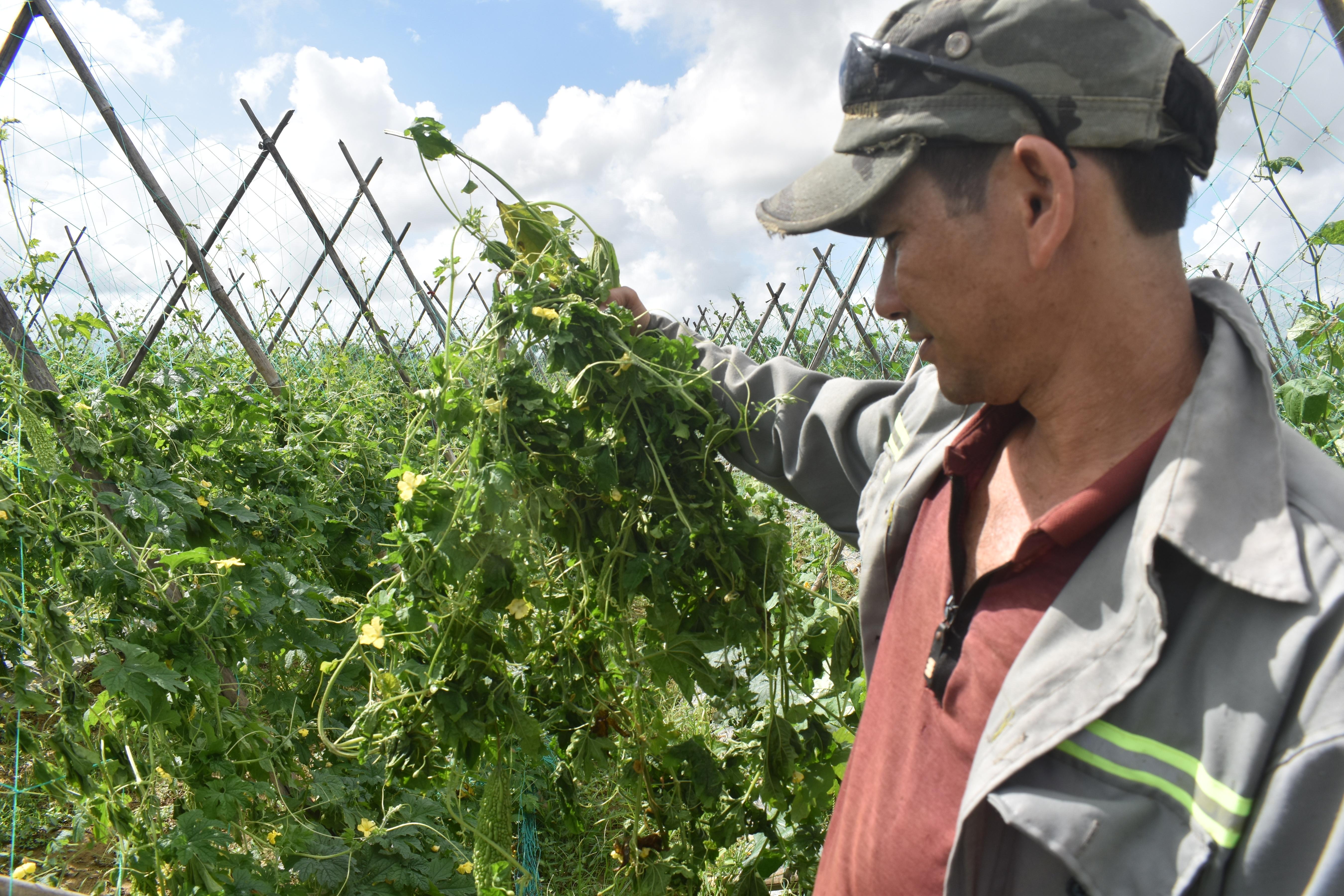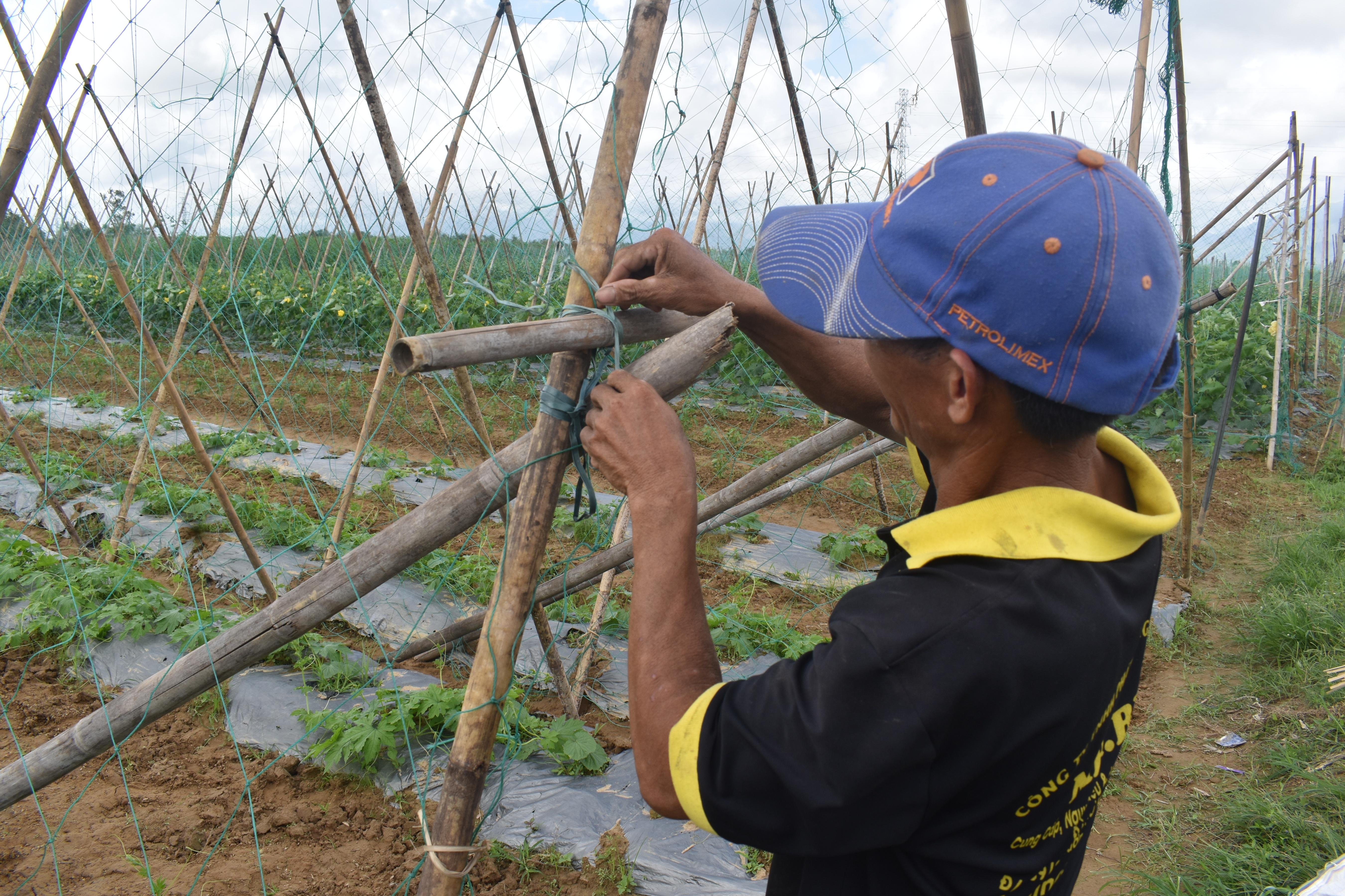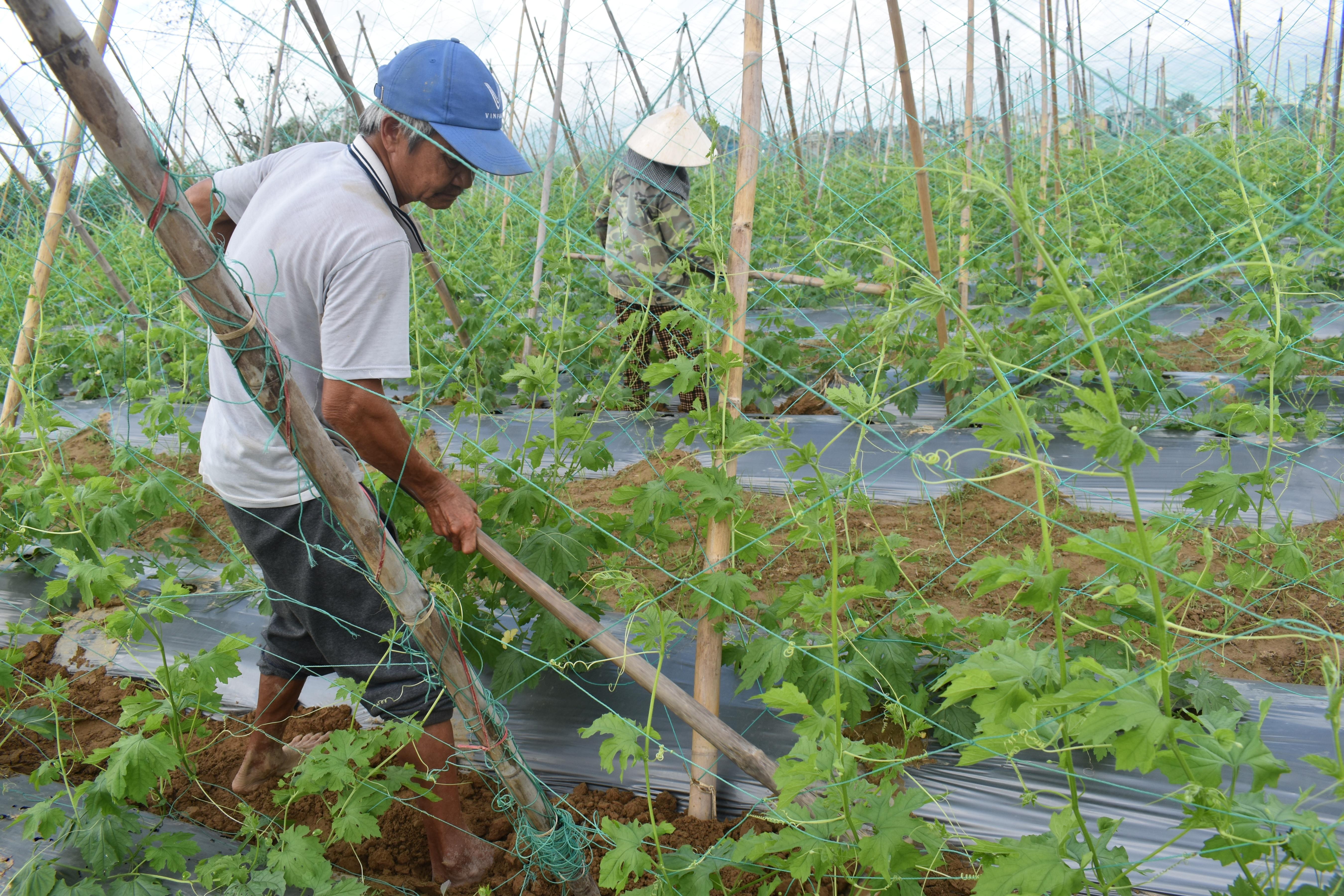Cách ruộng rau của gia đình ông Khánh khoảng 200m, gia đình ông Phan Nghĩa cũng đang tất bật cột dây, sửa soạn cho hàng khổ qua bò lên giàn. Ông Nghĩa cho hay, gia đình ông trồng hơn 4 sào rau màu ở cánh đồng Bàu Tròn, tính đến nay tiền vốn đổ vào đã hơn 10 triệu đồng để mua hạt giống; cọc tre, lưới, bạt làm luống…