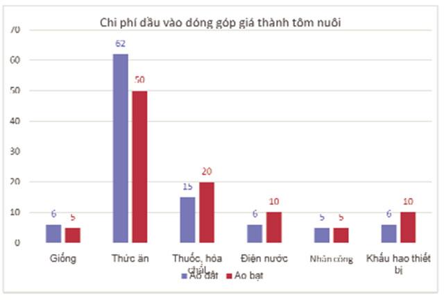 Tuy nhiên, tính trên diện rộng, tỷ lệ nuôi thành công trên ao đất hiện nay chỉ khoảng 30%, trong khi khoảng 40% mất trắng và 30% hòa vốn… Nếu thống kê cả tỷ lệ này vào thì chi phí để sản xuất tôm của hệ thống ao đất sẽ khoảng 90.000 - 100.000 đồng/kg. Vì vậy, ngành nuôi tôm chỉ mang lại hiệu quả khi giá bán tôm phải cao hơn giá thành sản xuất của toàn bộ hệ thống là 100.000 đồng/kg tôm nuôi ở cỡ 45 con/kg.Các chi phí đầu vào bình quân cho mô hình nuôi tôm ao đất thuận lợi và tăng trưởng tốt, đạt hiệu quả hiện nay chủ yếu là chi phí thức ăn (62%) và thuốc men, hóa chất xử lý (15%).