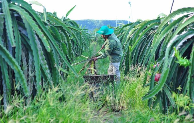Nông dân Bình Thuận tập trung vệ sinh vườn để chuẩn bị bước vào vụ chong đèn. Ảnh: Kim Sơ.