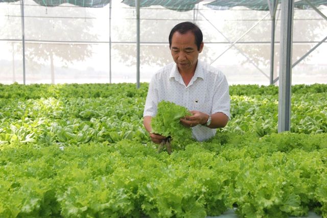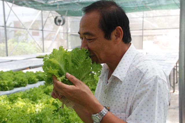 Ông Trần Đới cho biết, rau thủy canh trồng trong nhà kính, không sử dụng bất cứ loại thuốc bảo vệ thực vật nào. Nối tiếp thành công, HTX sẽ mở rộng sản xuất các loại rau khác, cà chua và hoa. Ảnh: Ngọc Vũ