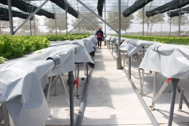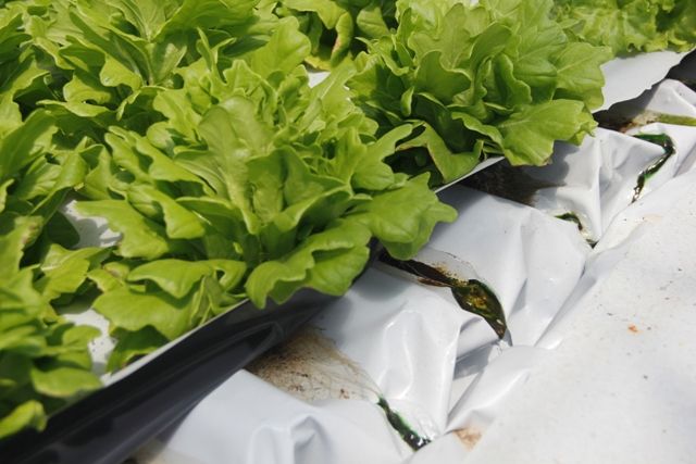 Vườn rau thủy canh được trồng trong nhà kính, có hệ thống dẫn nước hòa vi chất đến tận các khay rau. Ảnh: Ngọc Vũ