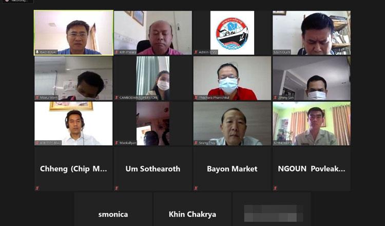 Cuộc họp trực tuyến giữa Bộ Thương mại Campuchia và đại diện các hãng siêu thị tại nước này. Ảnh: Kmhmer Times. |