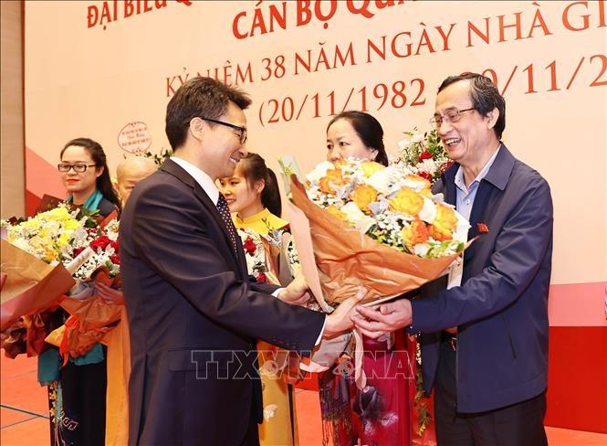 Phó Thủ tướng Vũ Đức Đam tặng hoa các đại biểu tại buổi gặp mặt. Ảnh: TTXVN |