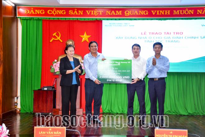 Chủ tịch Quốc hội Nguyễn Thị Kim Ngân và Bí thư Tỉnh ủy Lâm Văn Mẫn chứng kiến các đơn vị tài trợ Quỹ an sinh xã hội cho tỉnh. Ảnh: Báo Sóc Trăng |