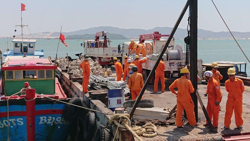 | CBCNV Điện lực Bình Định vận chuyển trang thiết bị lắp đặt lưới điện ra đảo Nhơn Châu |