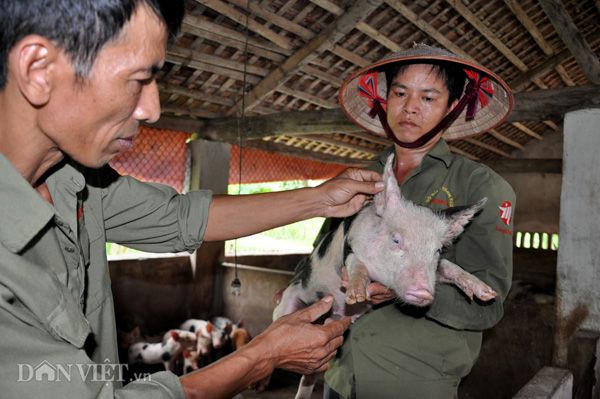 Ông Phan Văn Miền (trái) kiểm tra sức khỏe đàn lợn giống tại trang trại của gia đình ở huyện Yên Mô (Ninh Bình). Ảnh: Trần Quang