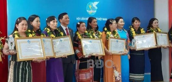 Chị Đinh Thị Nhuận (thứ 5, từ trái qua) nhận bằng khen của Trung ương Hội LHPN Việt Nam về thành tích xuất sắc trong thực hiện phong trào thi đua yêu nước giai đoạn 2015 - 2020. |