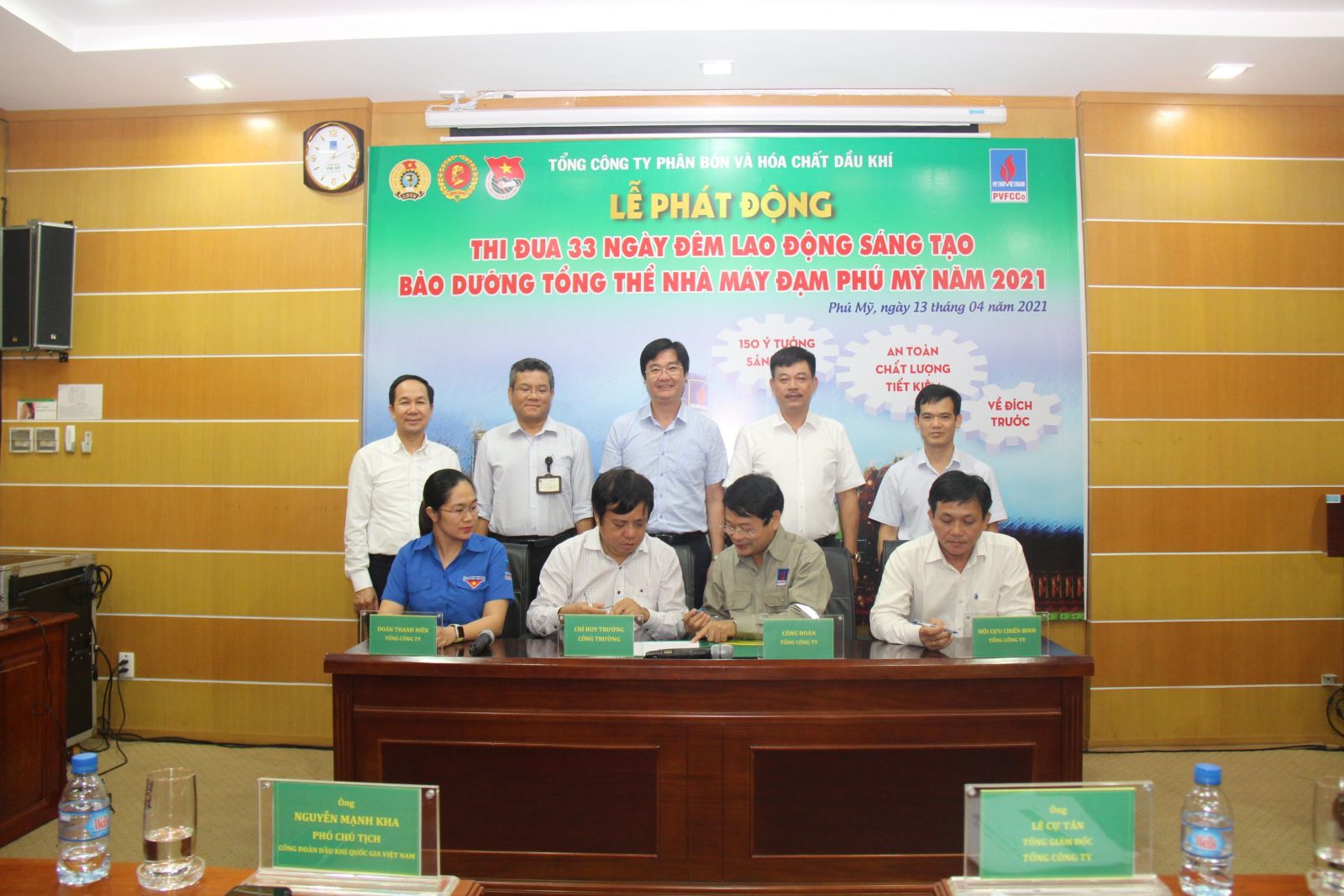 Được biết, công tác bảo dưỡng tổng thể Nhà máy Đạm Phú Mỹ trong năm 2021 có hơn 4000 hạng mục công việc cần bảo dưỡng, thay thế với khối lượng công việc lớn và là công việc khó khăn, đòi hỏi phải có sự đồng tâm hiệp lực, nêu cao tinh thần trách nhiệm, ra sức thi đua lao động giỏi, lao động sáng tạo, vượt qua các khó khăn, thách thức của từng cán bộ công nhân viên. Để thể hiện quyết tâm trong việc thực hiện nhiệm vụ bảo dưỡng, đại diện Công đoàn, Đoàn thanh niên, Hội cựu chiến binh Tổng công ty và Trưởng ban chỉ huy công trường BDTT đã ký bản giao ước thi đua phấn đấu hoàn thành kế hoạch bảo dưỡng tổng thể Nhà máy Đạm Phú Mỹ lần thứ 10 năm 2021, góp phần hoàn thành kế hoạch sản xuất kinh doanh năm 2021 của Tổng Công ty.