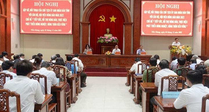Tại buổi đối thoại, đồng chí Nguyễn Văn Vĩnh, Chủ tịch Ủy ban nhân dân tỉnh Tiền Giang cho biết tỉnh Tiền Giang quan tâm xây dựng một nền nông nghiệp hiện đại, thông minh nên đang tập trung đào tạo nghề cho lao động nông thôn; hỗ trợ nông dân phát triển toàn diện nông nghiệp theo hướng liên kết sản xuất hàng hóa, thâm canh, chuyên canh, ứng dụng công nghệ cao; tổ chức lại hệ thống sản xuất nông nghiệp theo hướng thực hành sản xuất nông nghiệp tốt (GAP); hình thành các tổ hợp tác, hợp tác xã; đầu tư xây dựng kết cấu hạ tầng kinh tế-xã hội nông nghiệp, nông thôn.