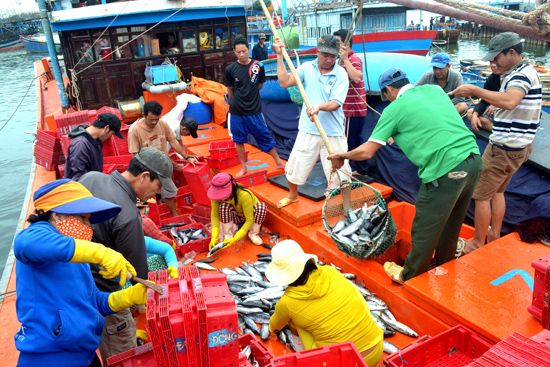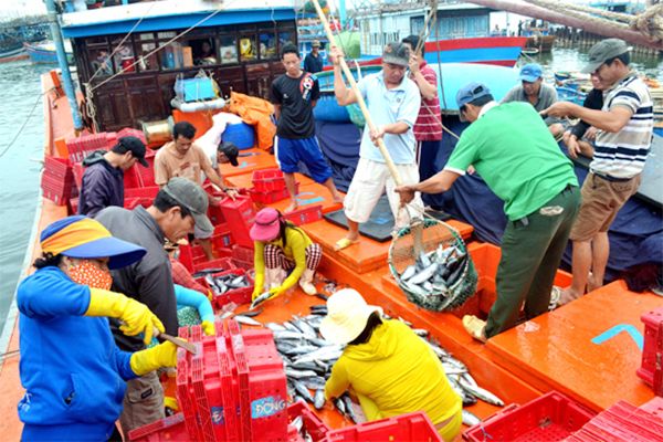 Đang vụ cá chính nên không khí sản xuất của ngư dân trong tỉnh rất rộn rã. Tại cảng cá Tam Quang (Núi Thành), nhiều tàu cá nối đuôi nhau cập bờ bán hải sản, nạp nhiên liệu, mua nhu yếu phẩm để lại nhổ neo vươn khơi. Gặp chúng tôi khi vừa trở về từ Hoàng Sa, ngư dân Đặng Ngọc Là (thôn Sâm Linh Tây, xã Tam Quang, Núi Thành) cho biết: “Chuyến biển đạt sản lượng, tôi và 10 bạn biển thu được tổng cộng 8 tấn cá sau 10 ngày bám biển, chủ yếu là cá ngừ, cá thu, cá bè và cá chang. Hải sản nhiều nhưng đầu ra không ổn”. Theo ông Là, cá bè và cá chang rất hiếm gặp, là sản phẩm có giá trị cao nhưng đầu nậu thu mua chỉ ở mức 21 nghìn đồng/kg. “Qua trao đổi giá bán hải sản, chúng tôi được nghe một số chủ tàu ở Quảng Bình, Nghệ An bảo vừa bán cá chang, cá bè với giá 30 nghìn đồng/kg. Vậy mà chừ mình chỉ bán được 21 nghìn đồng, quá thấp. Chừ không bán thì hải sản càng giảm giá trị” - ông Là cho biết.
