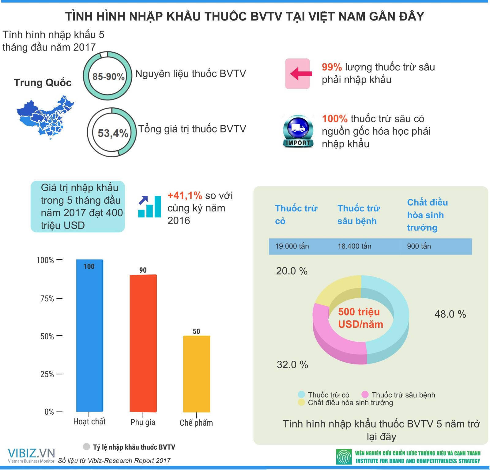Số liệu 5 tháng đầu năm 2017, nhập khẩu thuốc trừ sâu đạt 400 triệu USD (tương đương gần 9.000 tỷ đồng), tăng 41,1% so với cùng kỳ năm 2016.