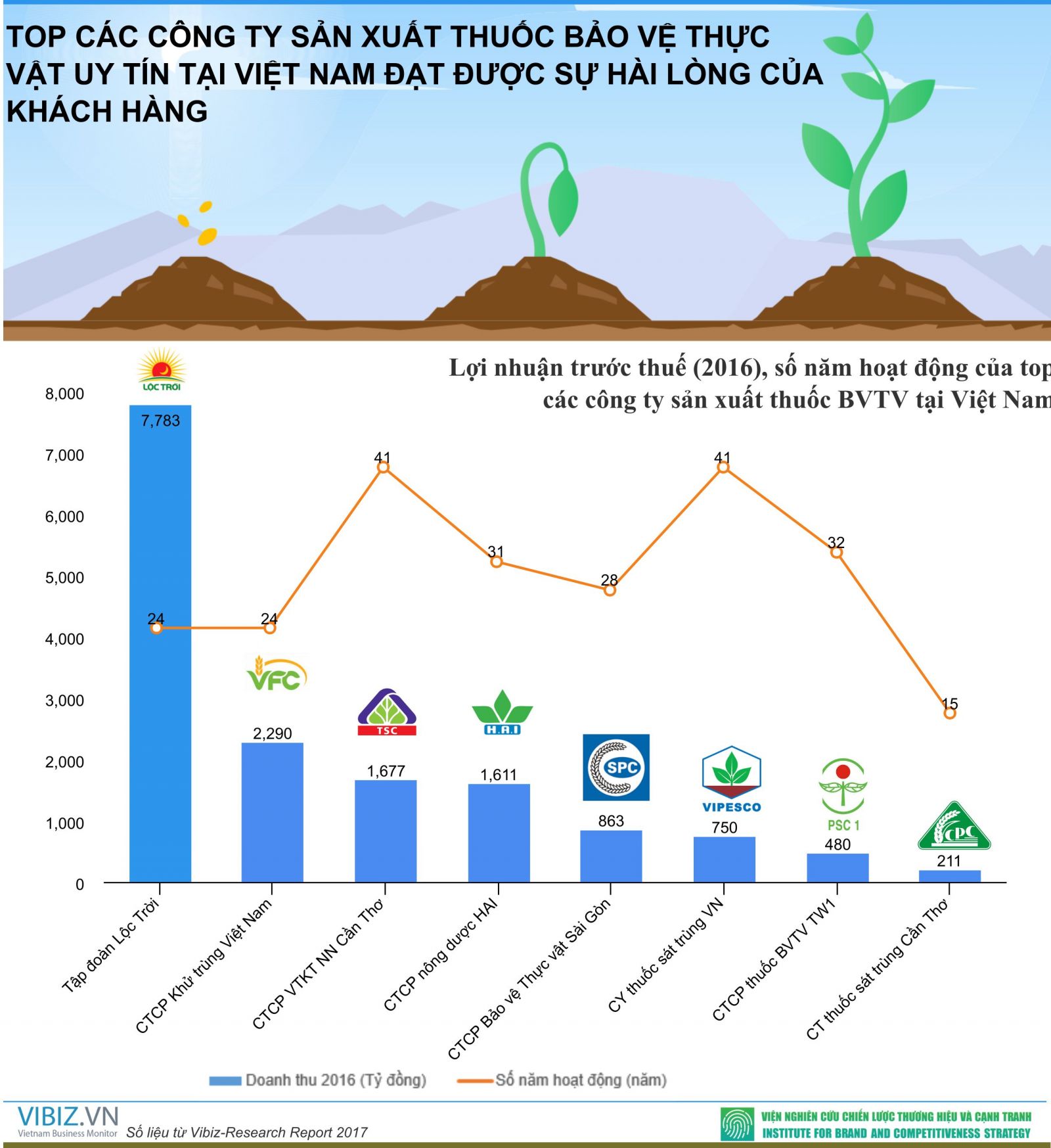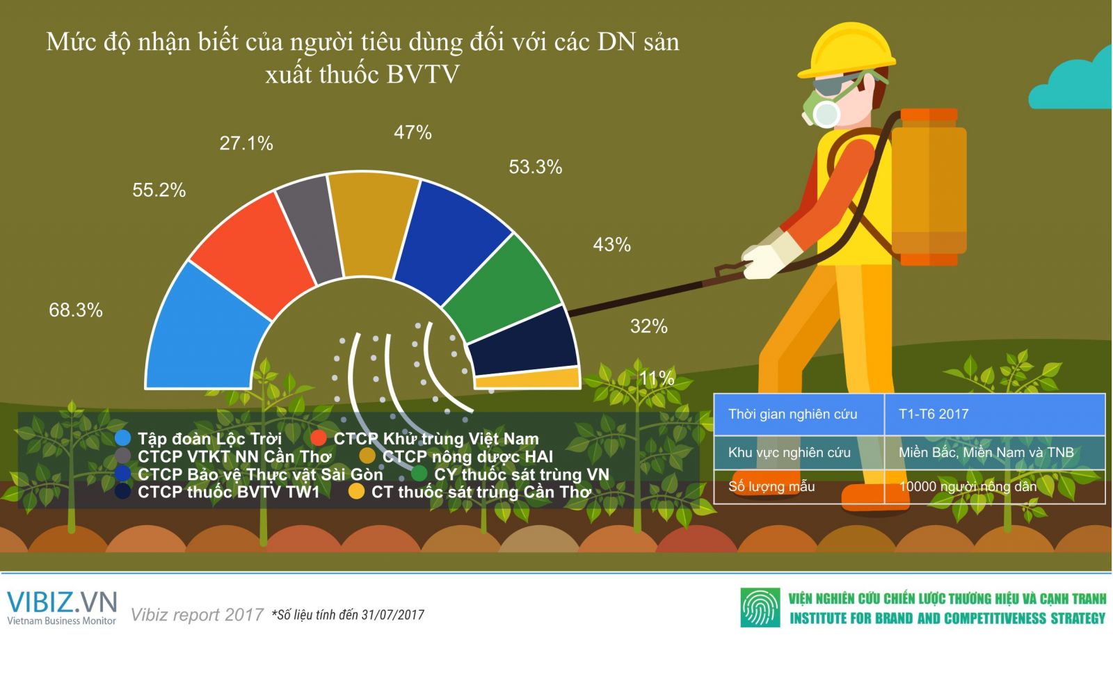 Số liệu xếp hạng các công ty sản xuất thuốc BVTV được Vibiz.vn nghiên cứu tổng hợp dựa trên kết quả hoạt động sản xuất kinh doanh của doanh nghiệp, kết hợp phỏng vấn 10.000 người ở các tỉnh phía Bắc và miền Nam và Tây Nam Bộ về mức độ tin dùng sản phẩm thuốc BVTV 6 tháng đầu năm 2017.